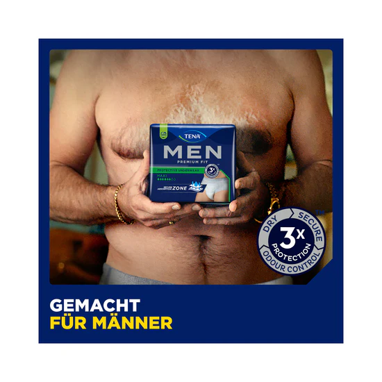 TENA Men Premium Fit Pants Maxi bieten Männern mit starker Blasenschwäche eine diskrete und zuverlässige Lösung, die sich wie herkömmliche Unterwäsche anfühlt.